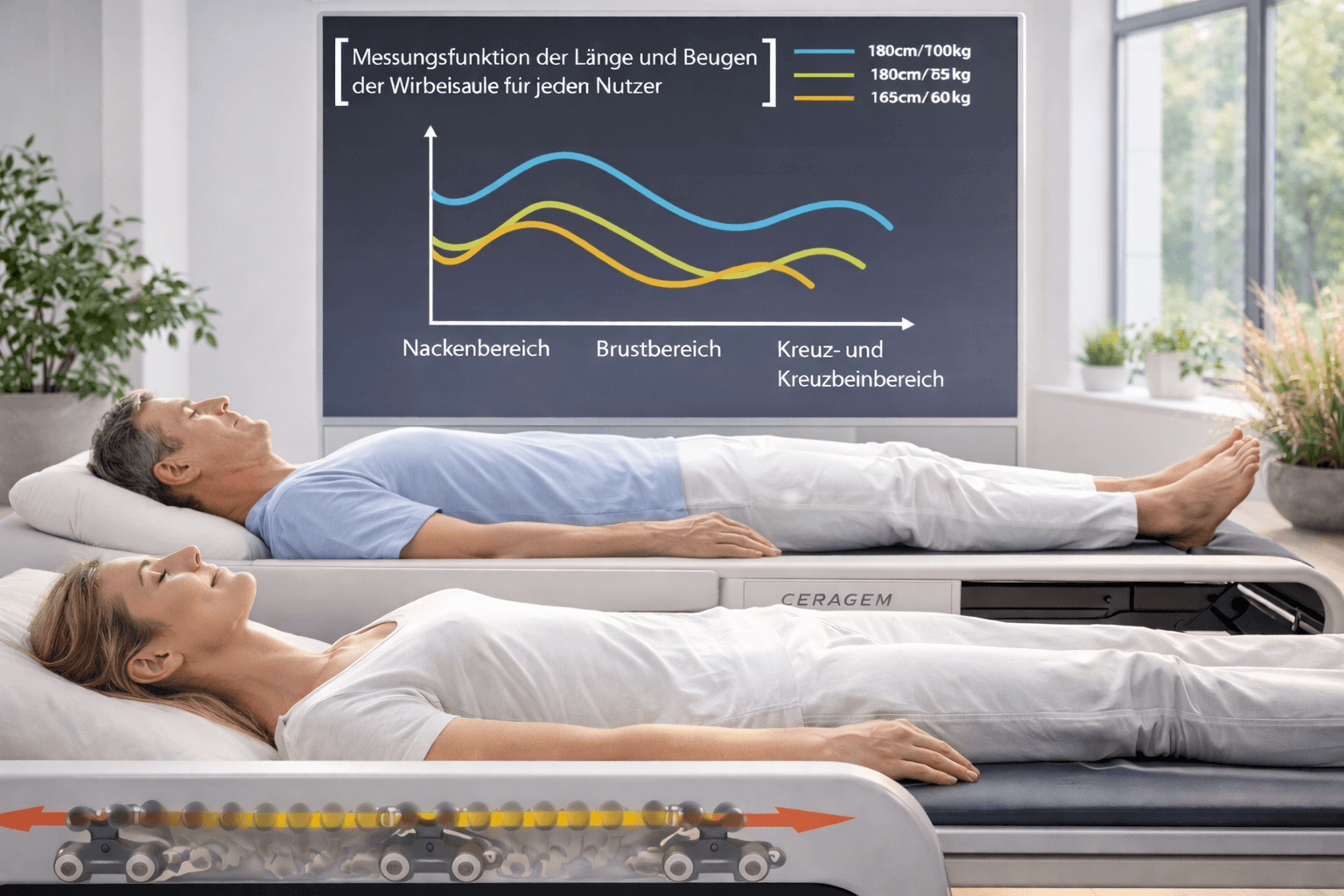 Gezielte Wärmeimpulse, thermische Wechselreize, pulsierende Lymphaktivierung, strukturierte Wirbelsäulenstimulation sowie diagnostische Stoffwechsel- und VNS-Analysen greifen ineinander und unterstützen Zellenergie, Stoffwechsel und vegetative Balance.